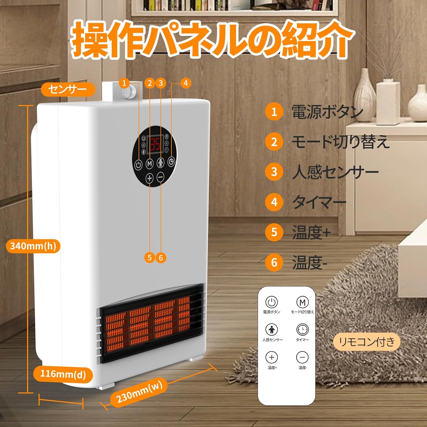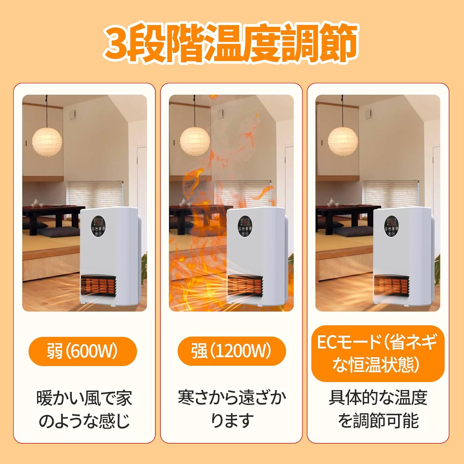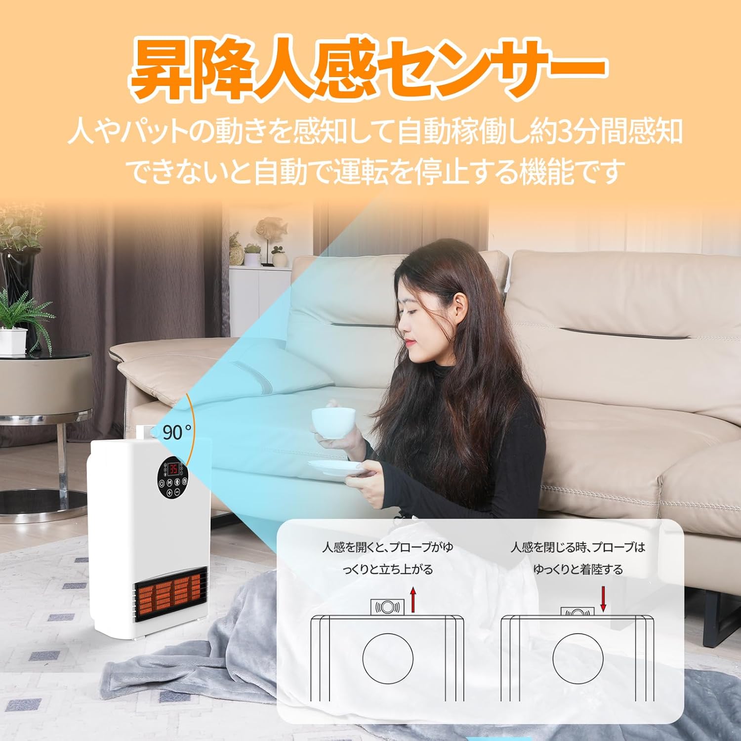 【最新型の昇降人感センサー付き】人感を開くと、プローブがゆっくりと立ち上がります。人感を閉じる時、プローブはゆっくりと着陸します。昇降人感センサーモードがあり、製品から3mの範囲で人やペットの動きを感知して自動稼動し、また、3分間以内に人やペットの存在を感知できない場合は自動的にスタンバイモードに入り、電力を浪費しません。※(初めて15秒で人があるかどうか感知します。感知できれば加熱し、できなければオフになります) 【3段階温度切替&恒温モード】部屋の広さや天候に合わせて、ヒーターの温度を調整できます。弱温風(600w)/高温風(1200w)/EC恒温(具体的な温度調節可能)の3段階が調節できます。ECモードではプラスとマイナスボタンで快適な温度を設定することができ、温度を設定すると暖房器はこの温度を維持して電力を節約することができ、温度の範囲は15~35 ℃です。※同時にプラスとマイナスボタンを3秒間押して童錠を開き、童錠状態は操作できません。この操作を繰り返して童錠を解除します。