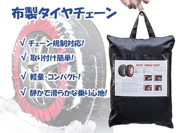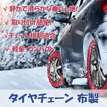 タイヤチェーン 非金属 布製 簡単装着 ジャッキアップ不要 ! 100%タイヤ覆う,低振動 ,低騒音 ! 【材質:布製】布製タイヤチェーンは緊急用の雪道滑り止め商品です。雪道でタイヤチェーン同等の機能を発揮しますが、耐久性等の特性がタイヤチェーンとは異なります。走行時も静かで、乗り心地も遜色なく走行できる布製タイヤチェーン 【 簡単装着】 かぶせるだけで取り付け超カンタン! 緊急用タイヤすべり止めです。 クリアランスの少ない車や輸入車にも装着可能! 厚さ約1mmなので、輸入車などにも装着でき、今までにない快適な乗り心地を体感できます。 【滑り止め強化】雪や氷の上でのグリップ力を最大限に発揮!! チェーンでもスタンドレスでもない特殊繊維が路面との摩擦面積を最大限に確保し、表面の毛羽立ちが雪面に張り付いていく際に生まれる抵抗性を利用したグリップ力が絶大な効果を発揮。
